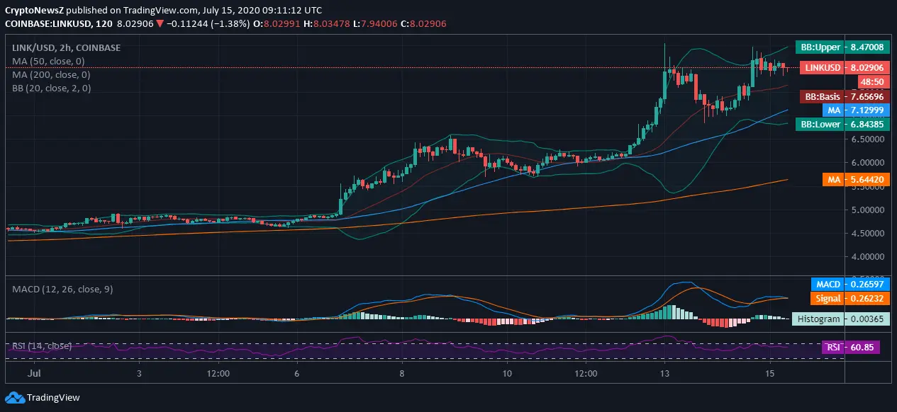 On the 12-hourly chart, LINK/USD is drawing a bullish crossover in intraday and a visible uptrend immediately after the market crash in March. However, the LINK price trend has been majorly flat yet bullish in the month of April and May 2020, when it lacked steady momentum. With the bullish crossover, Chainlink has regained complete support from 50-day and 200-day MA, and the price trend is hitting the upper band of 20-day Bollinger Bands as the coin in the intraday has regained the lost momentum.