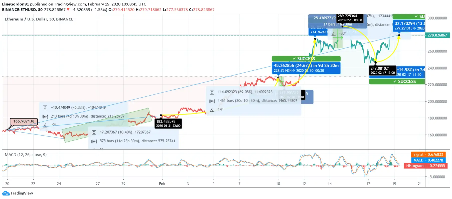 February began with a steady upward movement. From February 01 to 10, the ETH price changed from $183 to $228 by a massive 24.67% hike. With a slight plunge, the coin continued trading upwards, and on February 12, the price touched $274. In the next two days, the price of Ethereum slipped to $263. However, ETH’s price recovered and touched $289 on February 15. The selling pressure took the currency’s momentum and the price slipped to $247. Recently, the coin recovered and now it is trading above $278.