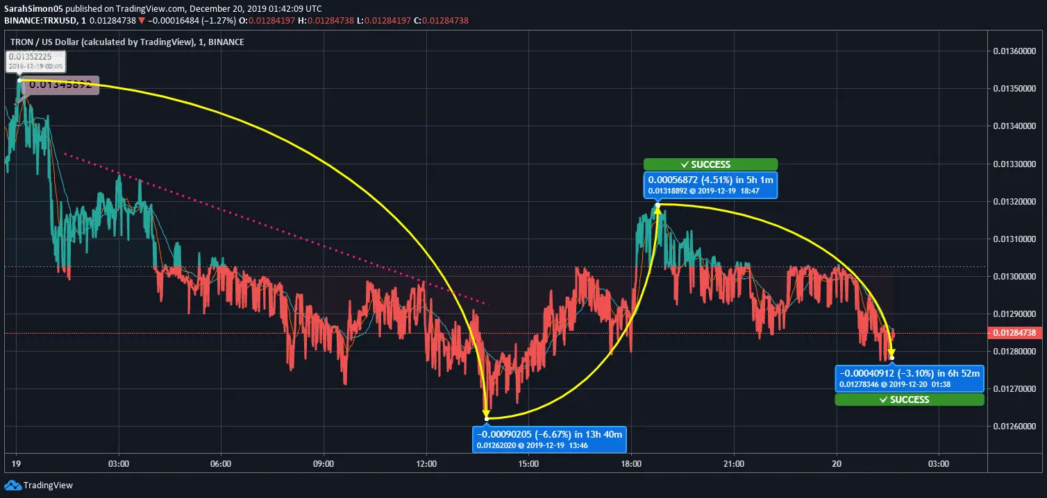 After the last day of marginal hikes, TRON seems to have lost the track again. Over the last 24 hours, it has shown three major price shifts and made an overall loss of 4.54%. It currently trades at 0.01284 USD. The range of the swings lies between 0.0135 USD and 0.0126 USD.